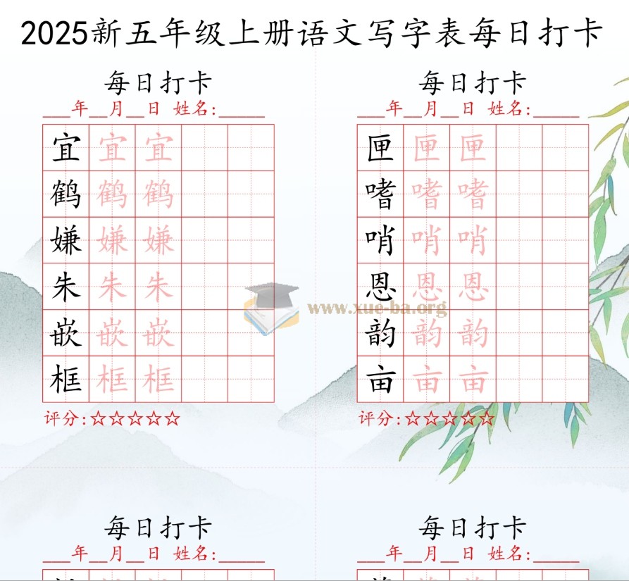 2025秋五年级上册语文写字表每日打卡练习.pdf