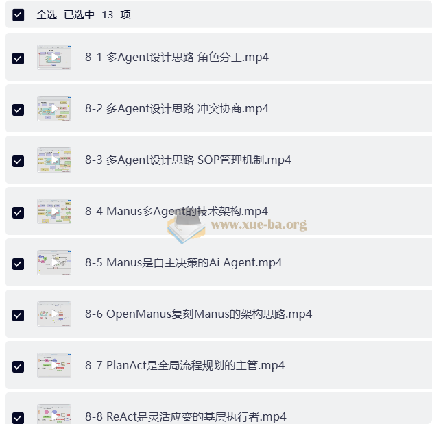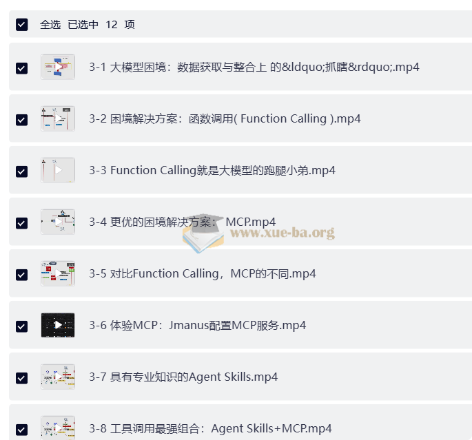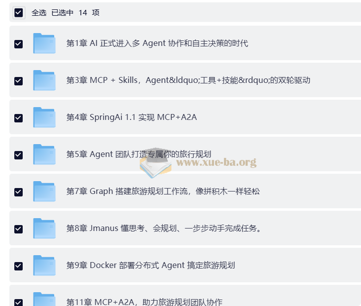 分享一个多Agent实战课程,前11章完整版。内容从大模型基础讲起,逐步深入MCP、SpringAI实现,手把手带你把Agent用起来——比如用多Agent+ReAct做旅行规划、通过Graph搭建工作流,还有Docker部署分布式智能体。全是能直接上手的干货,学完就能自己搭出能协作、会决策的AI系统。🔥