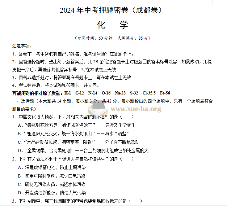 2024年 中考化学 考前押题密卷 (全国各地版本)